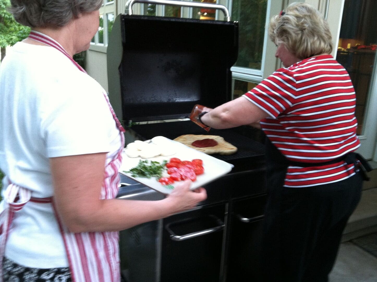 A woman is preparing a pizza on a grill at a cooking class in Eastern Iowa.